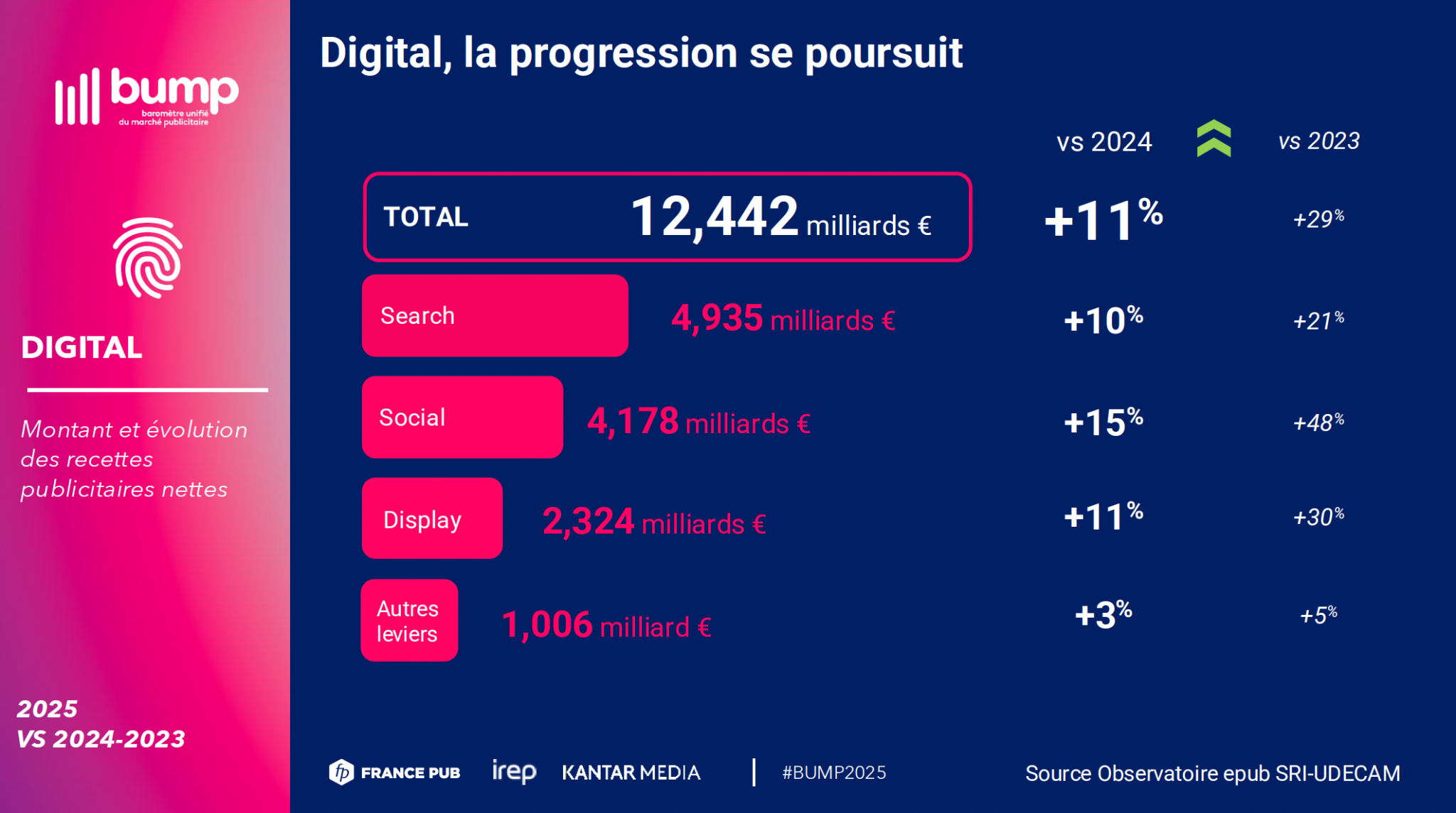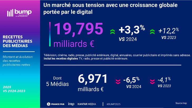 Selon le BUMP 2025, réalisé par France Pub, Irep et Kantar Media, les recettes publicitaires ont progressé d’environ 3,3 % en 2025. Une croissance plus modérée que les années précédentes et largement imputable à la progression de la publicité digitale (+11%, selon les données de l’Observatoire de l’e-pub du SRI, réalisé avec l’Udecam par Oliver Wyman).