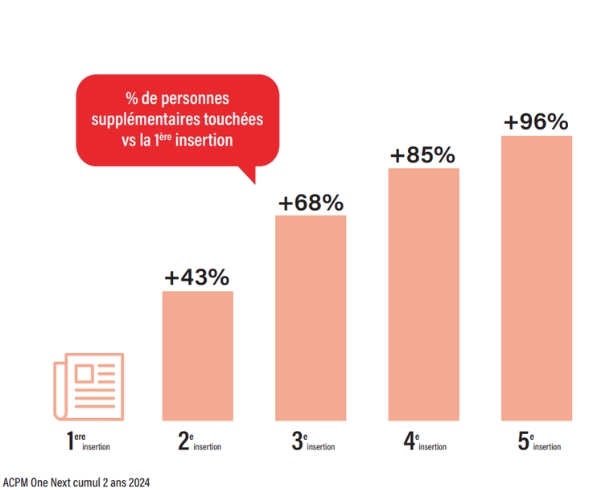 Concrètement, 2 insertions permettent de toucher 43 % de personnes supplémentaires par rapport à une seule parution. Et 3 insertions génèrent 68 % de couverture en plus.